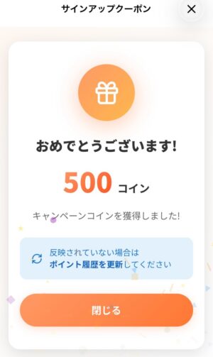 新規登録すると500コインのボーナスをもらえます