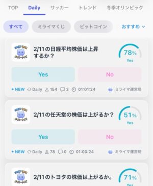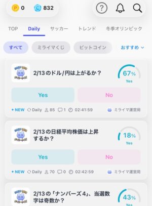 コインが貯まったら未来予想クイズに参加します。ほとんどのクイズは2択で結果を予想して投票します。