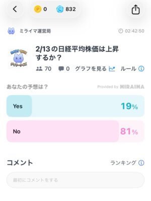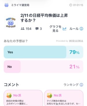 このクイズは「日経平均株価が上昇するか?」、上昇するは「Yes」、下がるは「No」を選択します。
