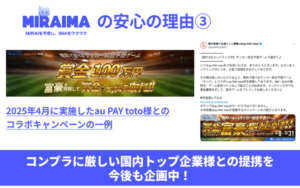 大手企業とのコラボ企画の実績があります(KDDIのau PAY totoなど)。また2026年の衆議院選挙と連動したキャンペーン企画なども多くのメディアに取り上げられていました。