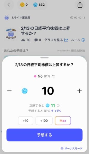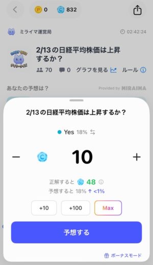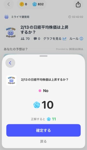 今回は「No」を選択し、ベットするコイン数を決め、「予想する」をタップし、確認画面で「確定する」をタップします。