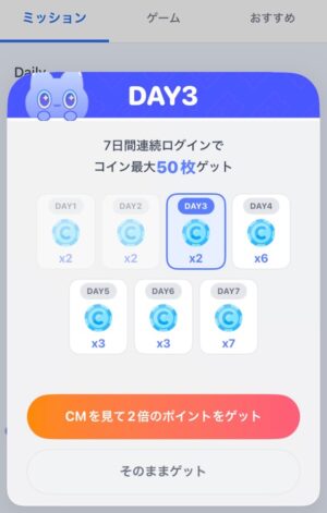 ログインボーナスは、毎日ミライマアプリを開くだけで貯まります。連続ログイン+CM視聴で最大50コイン貯めることができます。