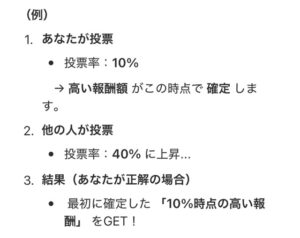 すべての選択肢へ投票することもできるので、獲得報酬の倍率によっては、戦略的に複数の選択肢へ投票するのもありです。