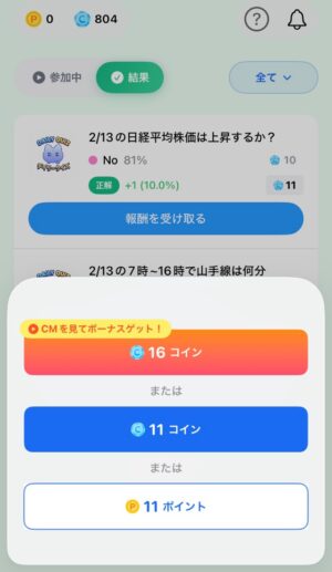 投票が正解すると、報酬をコインかポイントのどちらかで受け取ることができます。最初のうちはコインで受け取り原資のコインを増やしていくのが良いと思います。